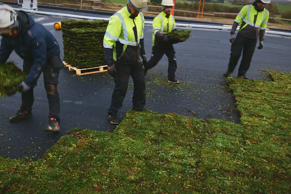 Projektleder hos DS Flexhal, Christian Møller, udtaler: “Til sedumtaget valgte vi bakkeløsningen fra Nature Impact, og det er vores underentreprenør Phønix Tag Aarhus, der har stået for udlæggelsen. Bakkerne er nemme at håndtere, og arbejdet har forløbet som planlagt. Nu står vi med et stort flot sedumtag.”